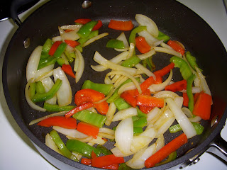 Saute onions and peppers in 2 tablespoons of olive oil on medium-high heat until tender and starting to brown.