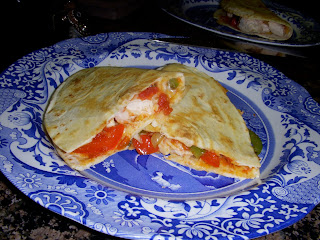4. Assemble a tortilla with hot sauce, chicken, onions, peppers, and cheese. Fold tortilla in half and add a thin layer of butter on each side.