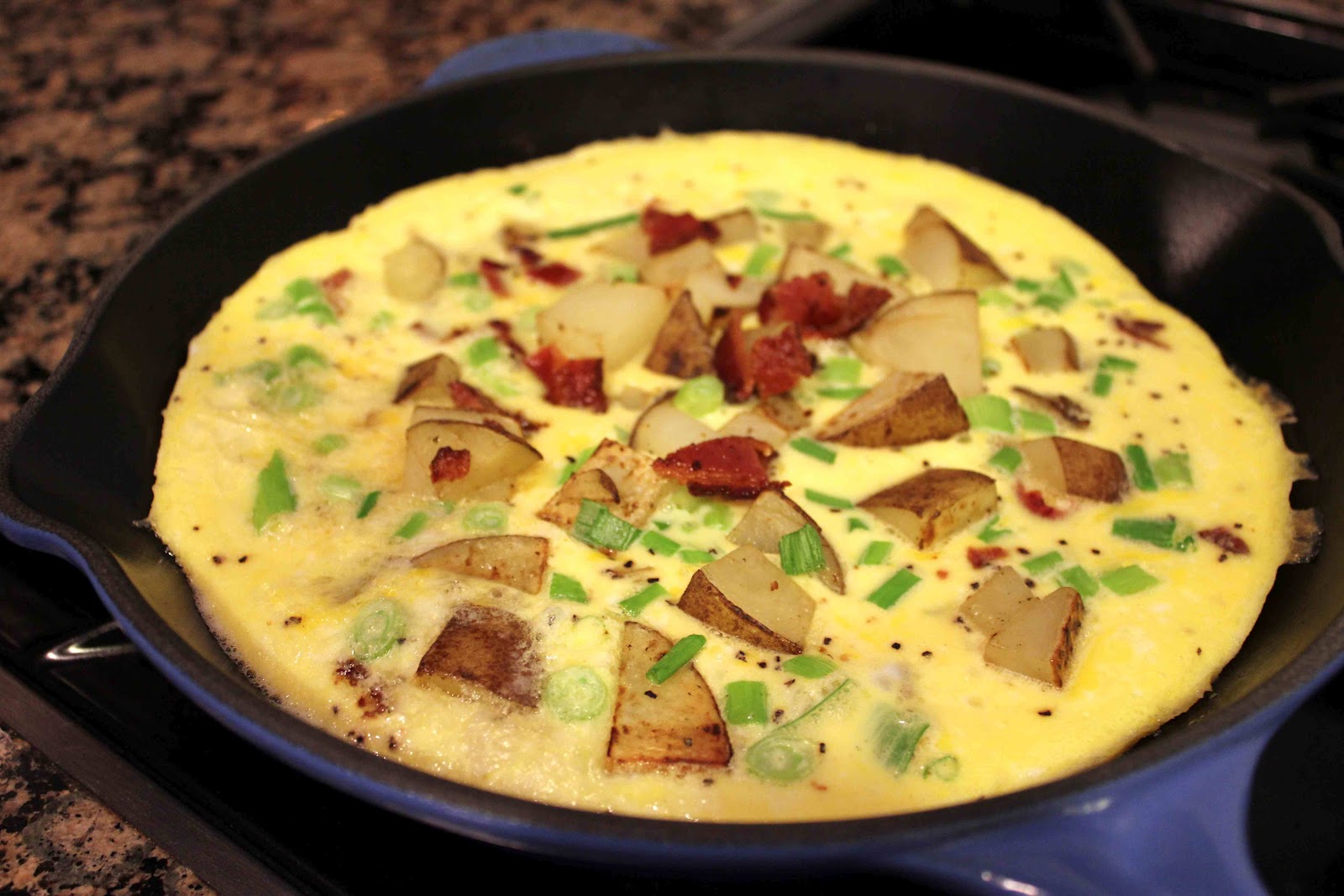 Pour egg mixture into hot skillet and sprinkle scallions, potatoes, and bacon on top. Place skillet in oven and bake for 6-8 minutes. |