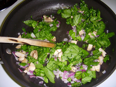 5. Raise the heat to medium-low and add the spinach and mushrooms, stirring constantly for 1 minute. The spinach should look wilted.