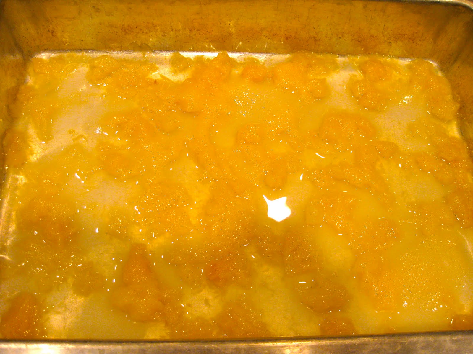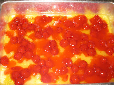 1. Spread the undrained pineapple in the bottom of a buttered 9 x 13 inch baking pan. Sprinkle with the sugar. Cover with the cherry pie filling.