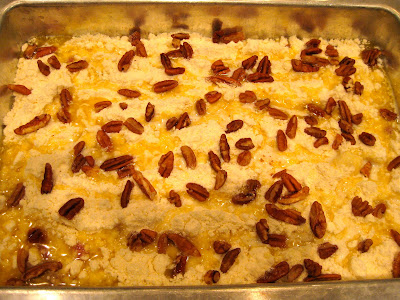 2. Sprinkle the cake mix evenly over the cherries. Drizzle with the melted butter. Sprinkle with the pecans.