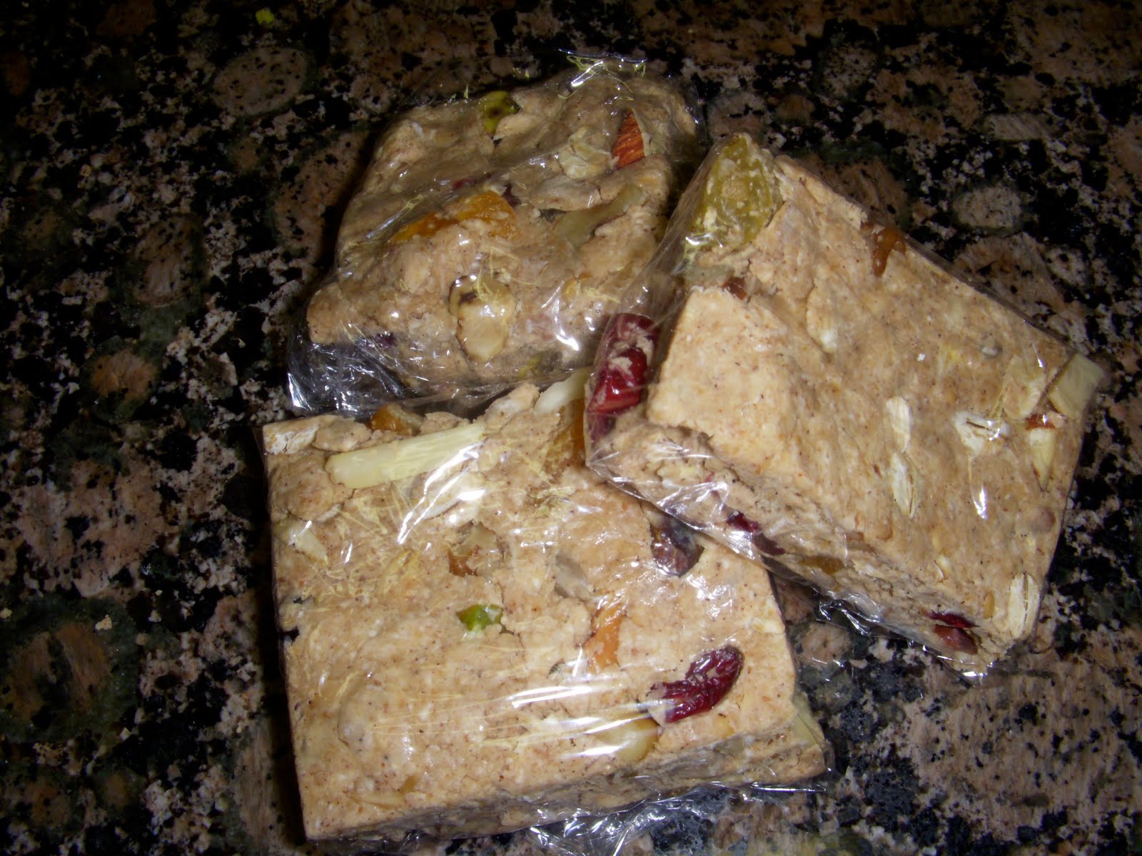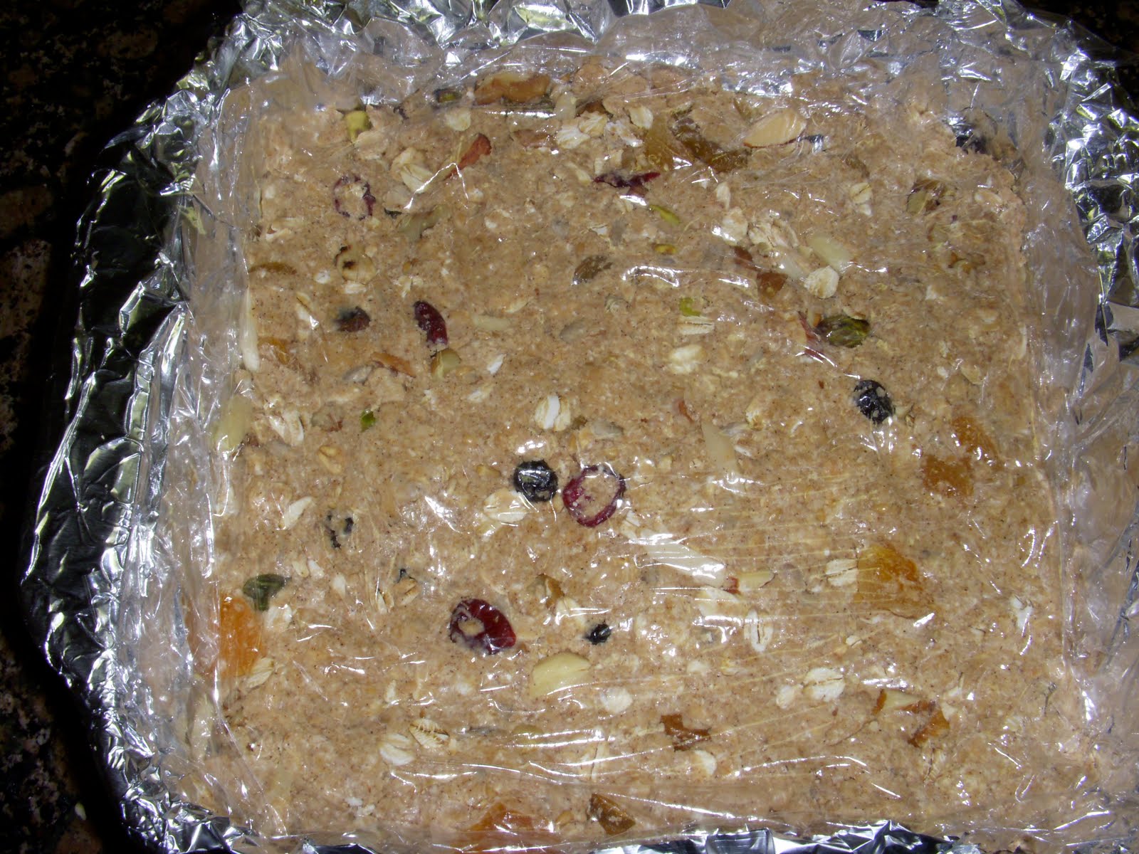 6. After an hour, remove and discard the plastic wrap. Use the foil to lift the mixture out of the dish. Slide the mixture off of the foil and cut the block into 8 bars. Place the bars in a sealable container. Since this mixture contains no preservatives, I recommend keeping them refrigerated.