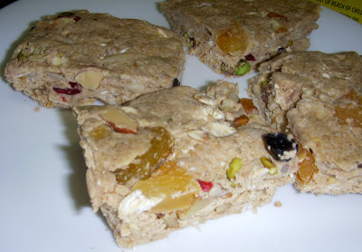 I have never made protein bars before but they were very easy and very good. These are much better for you than many of the brands you buy in the store. The only “fats” in these bars come from healthy fats from the nuts and peanut butter. There is only natural sugar such as the dried fruits and honey to add to the sweetness of the bar. My one complaint, though, was the protein powder. The recipe calls for 2 “scoops”, but I think my “scoop” was bigger than average. Because of this, my bars were a little crumbly and needed more liquid ingredients to hold them together. Next time I make them, I’m only using 1 “scoop”, or measuring out 1/4 cup. This recipe comes for the Tasty Kitchen blog. Enjoy!