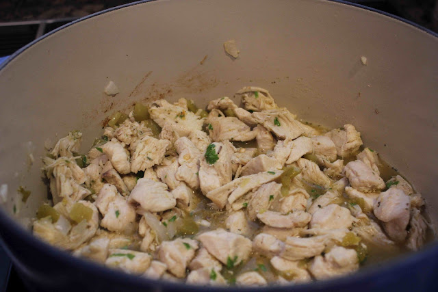 Add the broth, green chilies, and spice blend and simmer for 15 minutes.