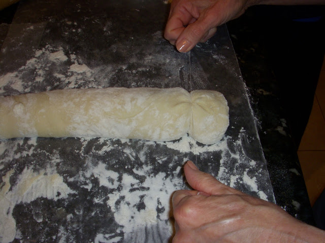 Cut dough into 1 1/2 inch slices with either a large butcher knife, or use thread to pinch off dough (like we did).