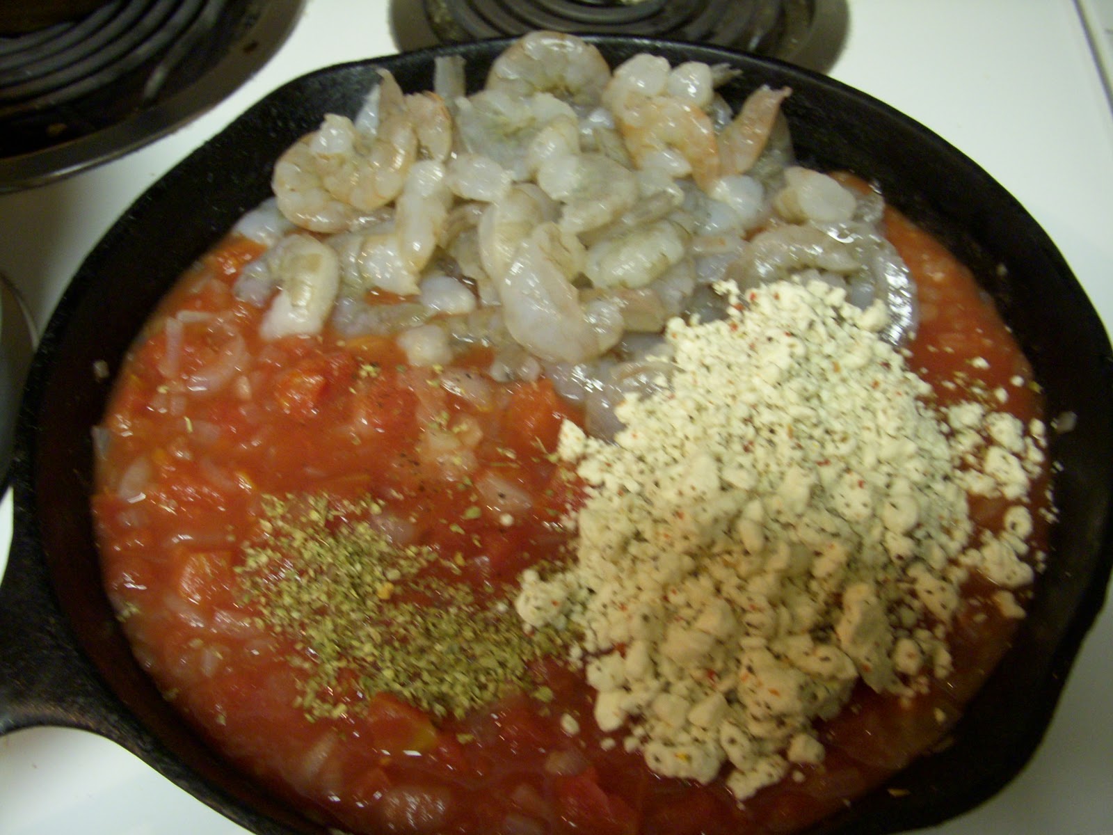 3. Remove from heat. Stir in the herbs, red pepper flakes shrimp, feta cheese, and salt and pepper to taste. Place pan in oven and bake, uncovered, until shrimp are cooked through, about 10-12 minutes.