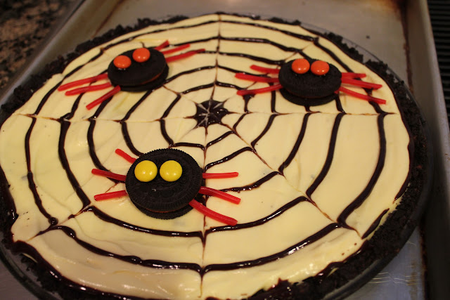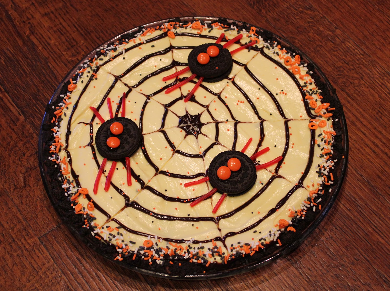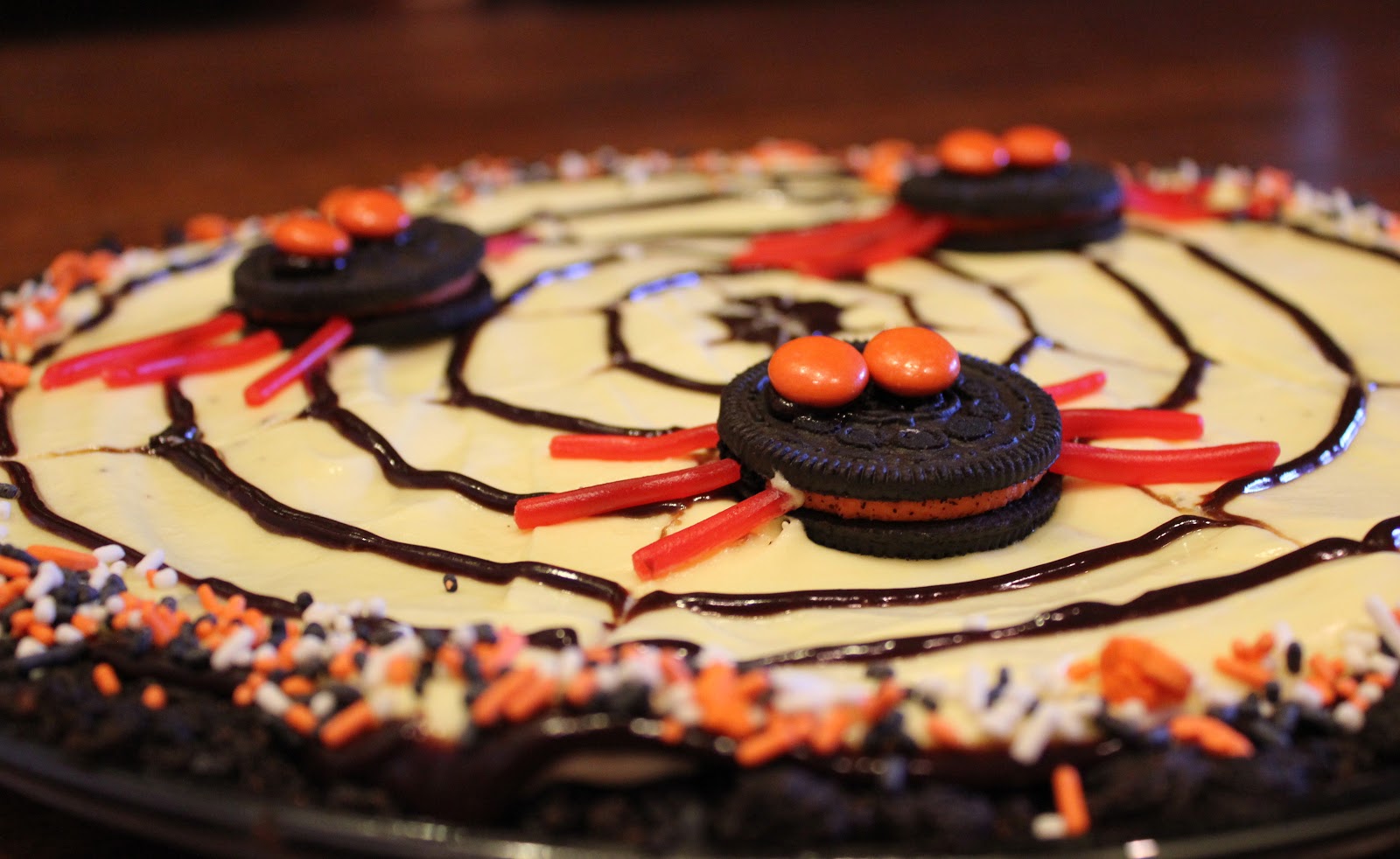 Oreo Spider Web Cookie Pizza Ingredients 25 Halloween OREO cookies, divided 1/4 cup butter, melted 1 oz. semi-sweet chocolate 2 cups thawed frozen whipped topping, divided 1 package (3.4 oz) vanilla flavor instant pudding 1 cup cold milk (I used skim) 3 pieces black or red string licorice (10 inch), cut into 1-1/4-inch pieces 6 small round candies (I used REESE’S Pieces) 1 Tbsp. leftover melted chocolate or ready-to-spread frosting 2 Tbsp. Halloween sprinkles