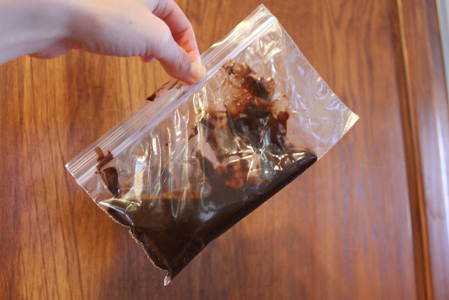 Place chocolate mixture in a small plastic bag. Cut a tiny hole in the corner.
